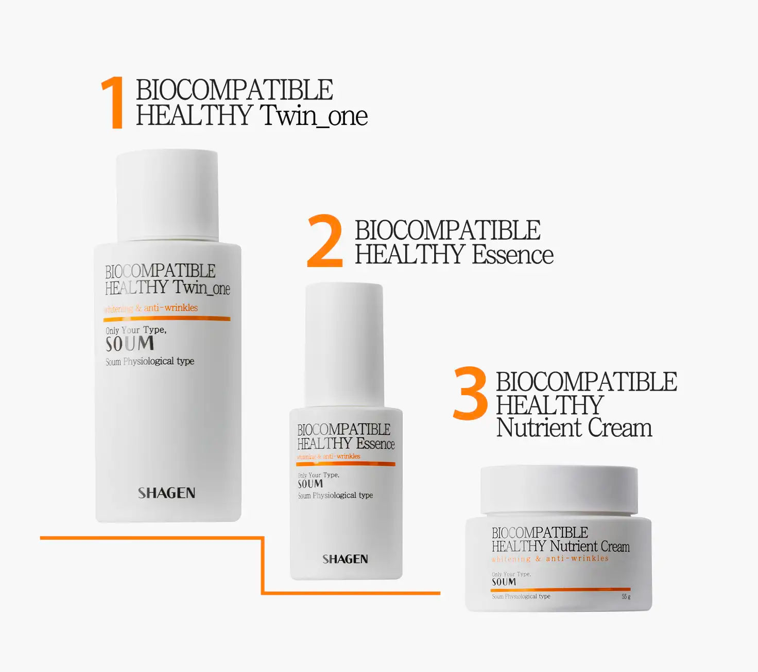 Shagen Soum (Turuncu) fizyolojik tipine özel olarak tasarlanmıştır. Enerji tipine uygun bileşenler, cilt dokusunu canlandırarak biyo-materyallerin etkin emilimini sağlar. Cilde pürüzsüz bir şekilde nüfuz ederek daha sıkı ve sağlıklı bir görünüm kazandırır. Soum enerji tipine sahip bireyler, stres ve dış etkenlere karşı daha hassastır, bu yüzden ciltleri hızlı tepkiler verir. Cilt mikrobiyomunu dengelemeye yönelik özel olarak geliştirilmiş Soum seti, sağlıklı ve parlak bir cilde kavuşmanıza yardımcı olur.
